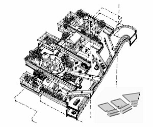 St. Petersburg-born architect Mark Khidekel presents a series of drawings and models implementing his vision for the WTC area as a memorial and living site. Above the wounded area, marked with two mysteriously lit symbolic candles, a gigantic structure on pillars will rise. "Vertical Highway" is Khidekel's futuristic vision of a new type of dwelling that would combine the American dream of having a private house, implemented in suburbia, and the rapidly growing demand for living in an urban environment like Manhattan. Proposed for the WTC area, it could convey the philosophy of the memorial site and a challenge for a ground-breaking endeavor in architectural development. The project envisions the construction of a multi-faceted skyscraper. The spiral nature of the highway leads to open-air plots at various levels, upon which the all-American ideal of living can be built: a house, garage, garden and even swimming pool. Khidekel's idea is to create a "second nature": the idea that, through architecture, we can create a fully new reality and natural environment.