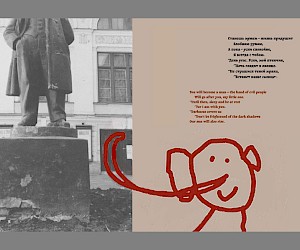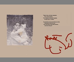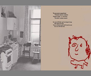 The Lullaby of Shaul Chernikhovsky, a Russian Hebrew poet, written in Hebrew in 1897, was discovered by Magaril and served as the inspiration for a series of collages. Combining photographs from his childhood, such as a communal kitchen or the shabby dilapidated backyard of the house he and his family lived in, with graphic drawings depicting a child full of childlike innocence and curiosity, evoking an excruciating sense of fear and danger to life in a totalitarian society after the recent genocidal war.