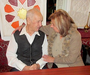 Как мы договорились с Евгением, он нас заберёт в 11 часов из отеля на встречу с отцом Моники. Когда я в 8 часов, как договаривались, постучала в дверь номера Моники, чтобы идти на завтрак, она открыла мне в ночной рубашке и сказала, что сейчас только 7 утра. Но это по австрийскому времени! Она быстренько собралась, и у нас ещё было достаточно времени, чтобы пойти погулять к пруду в парке недалеко от отеля. Позвонила Маша и сказала, что они задерживаются. Мы сидели в холле отеля, когда неожиданно в нём появилась семья в полном составе: отец, Евгений, его жена и Маша! Это было так неожиданно, так как никто не рассчитывал на приезд 92-летнего Фёдора Фёдоровича! Мы думали, что нас отвезут к нему на квартиру! С одной стороны, это было хорошо, потому что удалось избежать чрезмерных волнений Моники, которые, вероятно, её охватили бы, с другой стороны, никто не фотографировал встречу, т.к. все приветствовали и обнимали друг друга. Я тоже была так растеряна, что не смогла фотографировать даже на свой мобильный телефон, это было что-то завораживающее. Моника подошла к отцу и сказала ему по-русски: «Я Моника, твоя дочь! Из Австрии!». Отец только приветливо улыбался. Не было похоже, что он узнал её. Спустя короткое время всё общество двинулось в направлении кафе. Лишь Евгений сделал несколько снимков, но они были постановочные, а не спонтанные. Только в кафе я нашла, наконец-то, в сумке свой фотоаппарат и начала фотографировать.