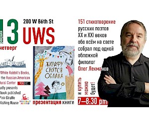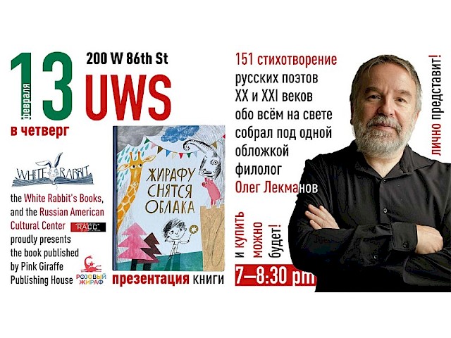 Thursday, February 13, 19:00 - 20:30 PM"151 poems by Russian poets of the 20th and 21st centuries about everything in the world: about bagels and airplanes, about Indians and Christmas tree balls; about cats, dogs, crocodiles, porcupines, hedgehogs, mice, elephants, giraffes and more.