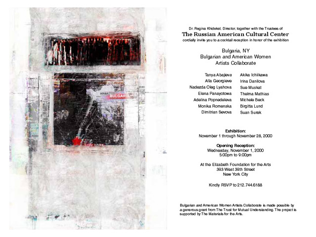 The participating Bulgarian women artists - Tania Abajieva, Nadia Genova, Alla Georgieva, Nadezhda Oleg Lyahova, Elena Panayotova, Adelina Popnedeleva, Monica Romenska, will collaborate in New York with American women artists - Michele Beck, Irina Danilova, Akiko Ichikawa, Brigitta Lund, Thelma Mathias, Sue Muskat, and Suzy Surek.