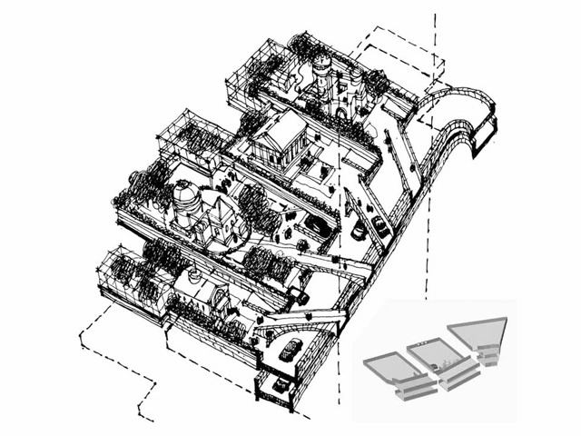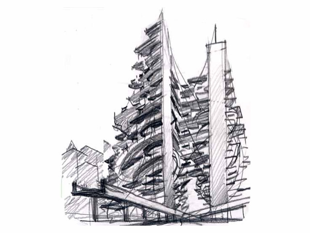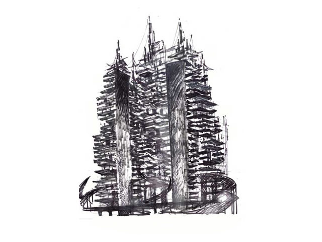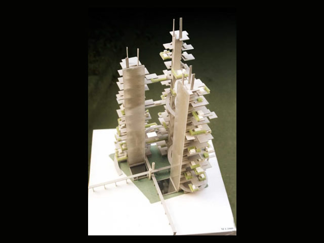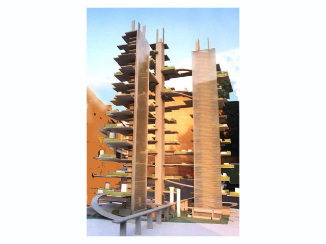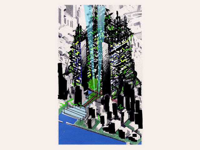 St. Petersburg-born architect Mark Khidekel presents a series of drawings and models implementing his vision for the WTC area as a memorial and living site. Above the wounded area, marked with two mysteriously lit symbolic candles, a gigantic structure on pillars will rise. "Vertical Highway" is Khidekel's futuristic vision of a new type of dwelling that would combine the American dream of having a private house, implemented in suburbia, and the rapidly growing demand for living in an urban environment like Manhattan. Proposed for the WTC area, it could convey the philosophy of the memorial site and a challenge for a ground-breaking endeavor in architectural development. The project envisions the construction of a multi-faceted skyscraper. The spiral nature of the highway leads to open-air plots at various levels, upon which the all-American ideal of living can be built: a house, garage, garden and even swimming pool. Khidekel's idea is to create a "second nature": the idea that, through architecture, we can create a fully new reality and natural environment.