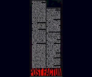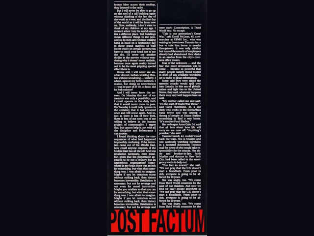 Post Factum is the first installment in a series of Julia Nitsberg's exhibitions that are reflections on the events and the aftermath of the September 11 attack on the World Trade Center, NYC, United States, and the rest of the civilized world. The choice of an office building for this particular installation is consistent with its theme.