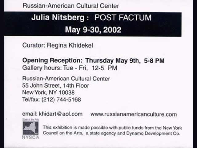 Russian-born Julia Nitsberg calls herself artist/provocateur and believes in social function of the work of art. The importance for an individual to assume full personal responsibility for his actions is a constant subject of her work.