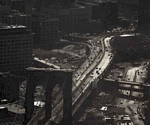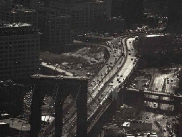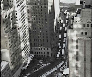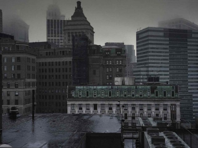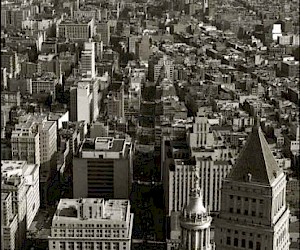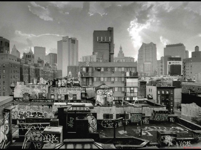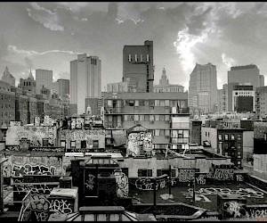 New York skyline was photographed for as long as it exists. And when the humanity invented the flying machines, they were used to photograph the urban landscape from above. Nothing though can provide the additional benefit of being up on the roof or a higher floor of the skyscraper, spending the time to frame a shot, to choose the position. It is indeed the very ability of the spectator/artist to stop, if not to go back in time, and concentrate, taking the time and looking at the same part of urban glory – or blight – and absorb the message sent a hundred years ago and quietly emanating non-stop from the copper and stonework of the haze and smog-veiled pyramids of New York skyline.