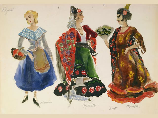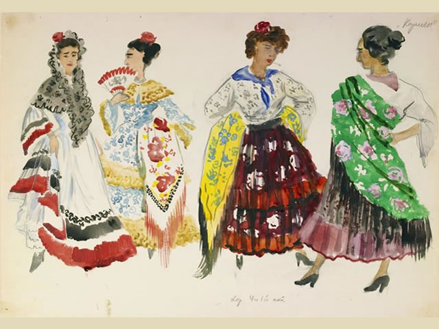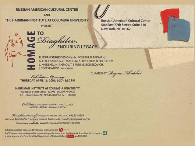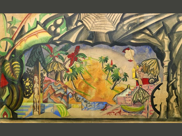 This exhibition features works created between 1910 and 1969 by avante-garde Russian artists in the Soviet Union and abroad. It features watercolor and gouache paintings of set and costume designs by such influential Russian artists as N. Roerikh, G. Yakulov, B. Erdman, A. Ferdinandov, L. Khidekel, T. Bruni, P. Tchelitchev, A. Tishler, N. Akimov, G. Boriskovich, I. Sevastianov and others. Serge Diaghilev’s influence on the performing arts allowed these artists to use theatrical design as a legitimate platform for artistic expression.