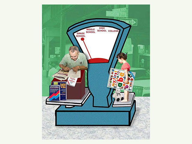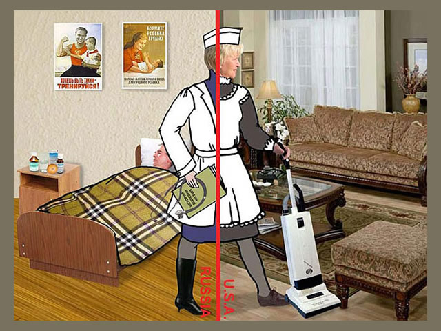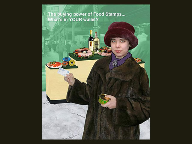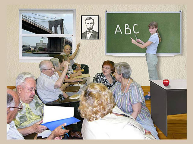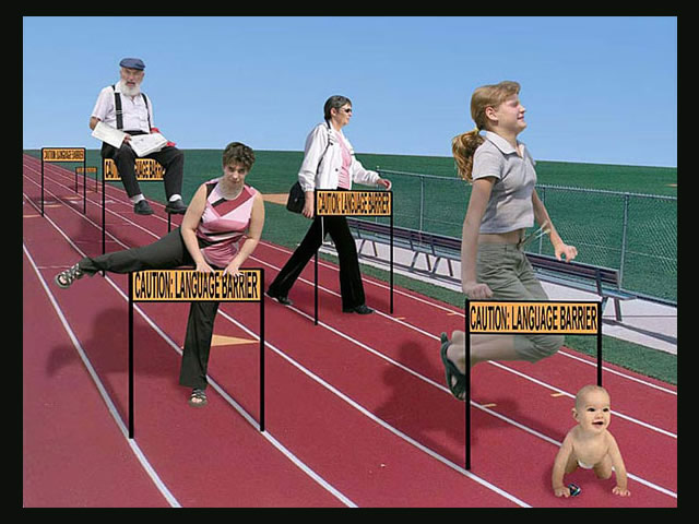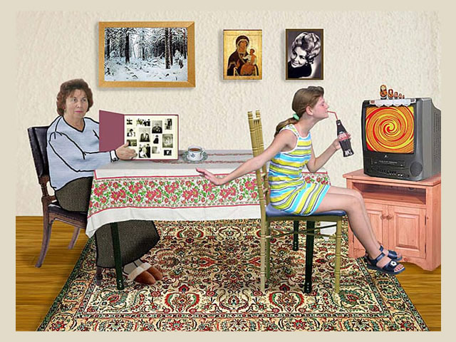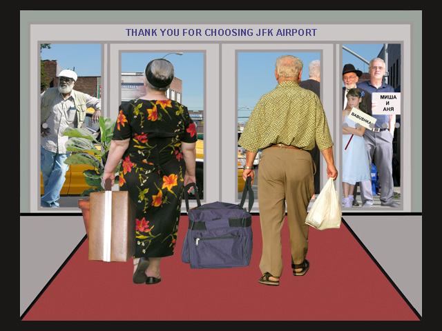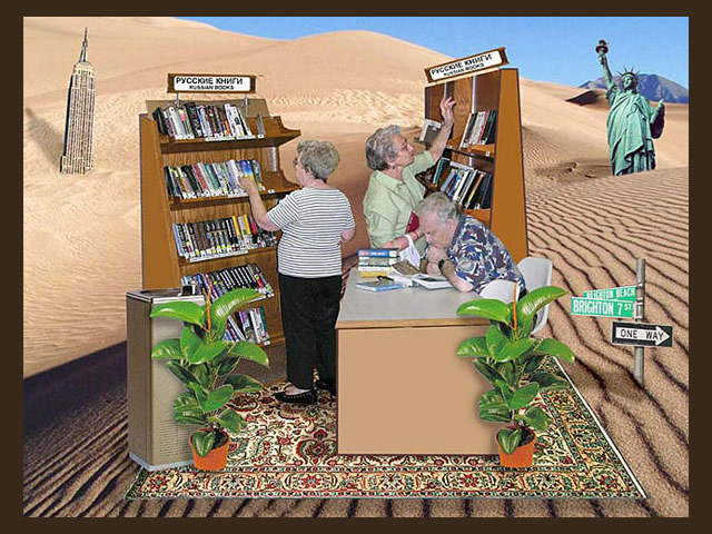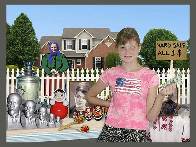 A quote from the artist: "As an immigrant from the former Soviet Union, I am keenly aware of the culture shock and challenges that recent immigrants face in their new country. This series of 15 posters explores issues of the immigrant life such as the language barrier, generation gap, nostalgia and constant search for and redefinition of a Russo-American identity. I construct my narrative digital collages based on the aesthetic of the Soviet propaganda posters, using mostly images and very little text to make a stronger visual statement that can transcend the language barrier. I integrate both photography and illustration into my work, using the new digital medium to bring these issues into the 21st century. My goal is not photorealism, but a clear message. I explore these serious issues with a sense of humor, inviting the viewer to do the same."