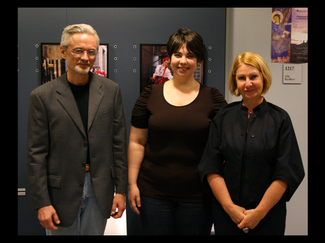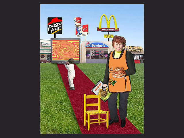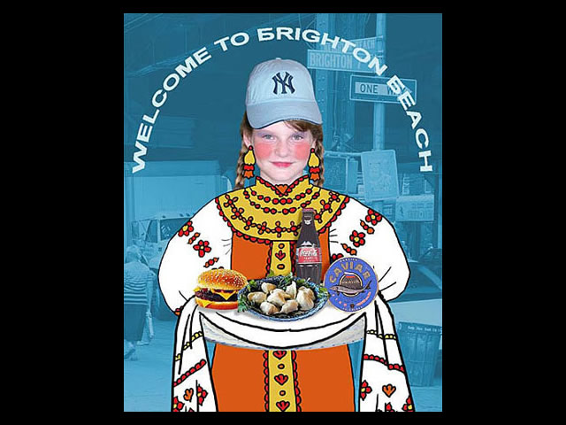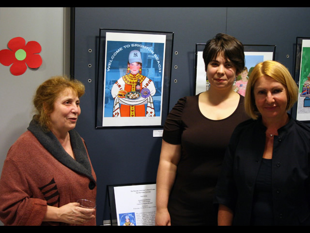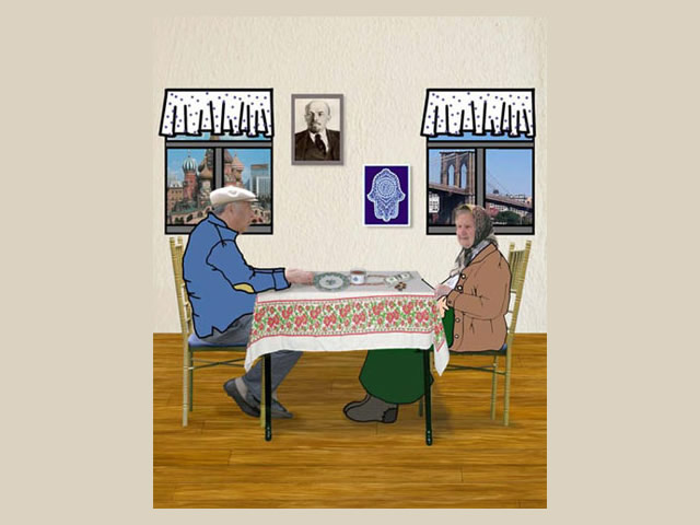 This exhibition is comprised of two series of narrative digital collages, “IroNY Curtain” and “Fitting Ukraine.” Both refer to Soviet propaganda posters and explore the concept of fitting together two cultures, including issues of language barriers, generation gaps, nostalgia, and the constant search for a new Russo/Ukrainian/Jewish-American identity. By using a new digital medium that integrates photography, illustration, and stage painting like scenes, these issues are carried into a 21st century context. Going through the heart-breaking process of resolving the conflict between a Ukrainian childhood and an American present, during which some traditions are left to be replaced by new ones, the artist uses a lighthearted and sometimes humorous expression of her sense of being as an immigrant.