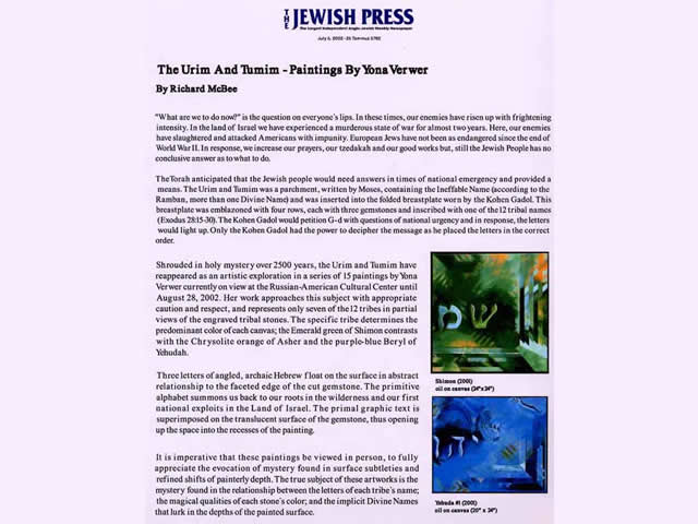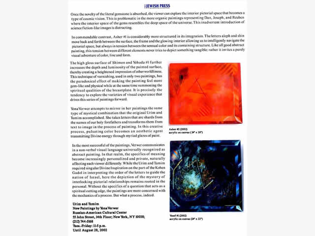 Verwer's latest paintings are based on the Urim and Tumim, the essence of the "breastplate of judgment." During time of war, this breastplate was worn and consulted by the High Priest of Israel. It was mounted with twelve precious stones, upon which were engraved the names of the Twelve Tribes. The individual letters would illuminate to display prophetic messages, hence the "judgment."